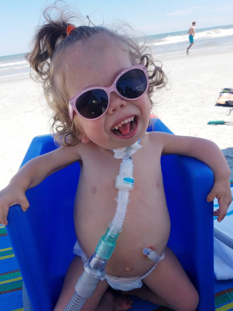 We ventured back to the beach that summer for our family vacation. Again, she loved the pool, but was still leery around the ocean and absolutely hated sand. Honestly, it was for the best that she didn’t want anything to do with sand seeing as that stuff gets absolutely everywhere. It would be really dangerous to get sand near her stoma, seeing as the hole in her neck that holds the trach goes directly to her lungs. (The same reason we exercise such caution around water.)