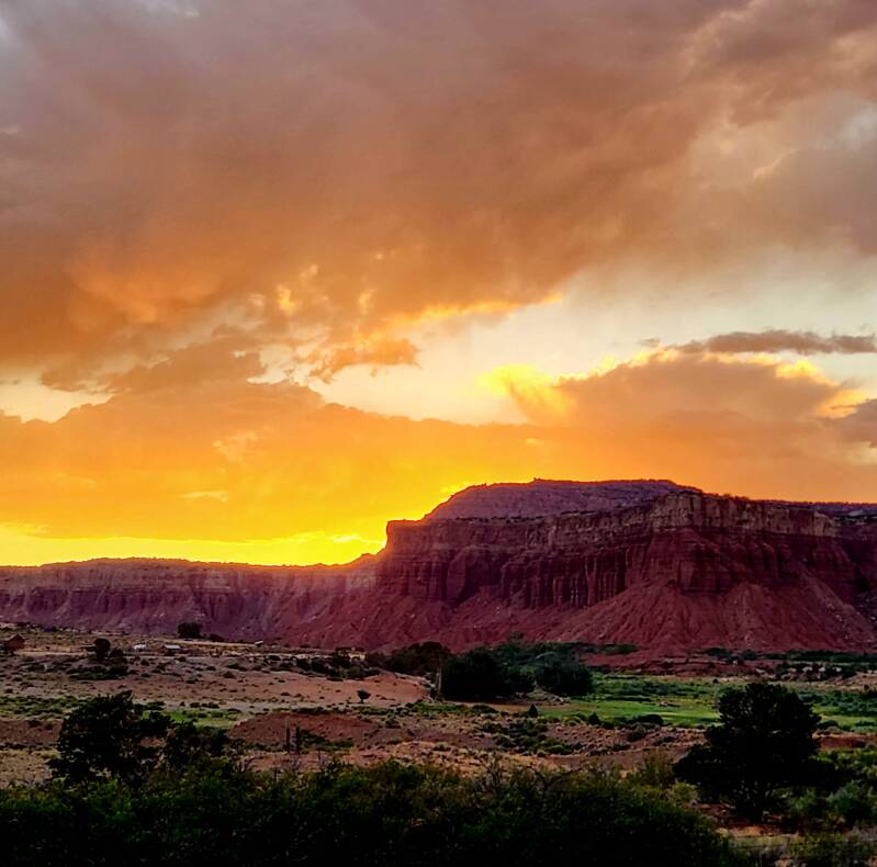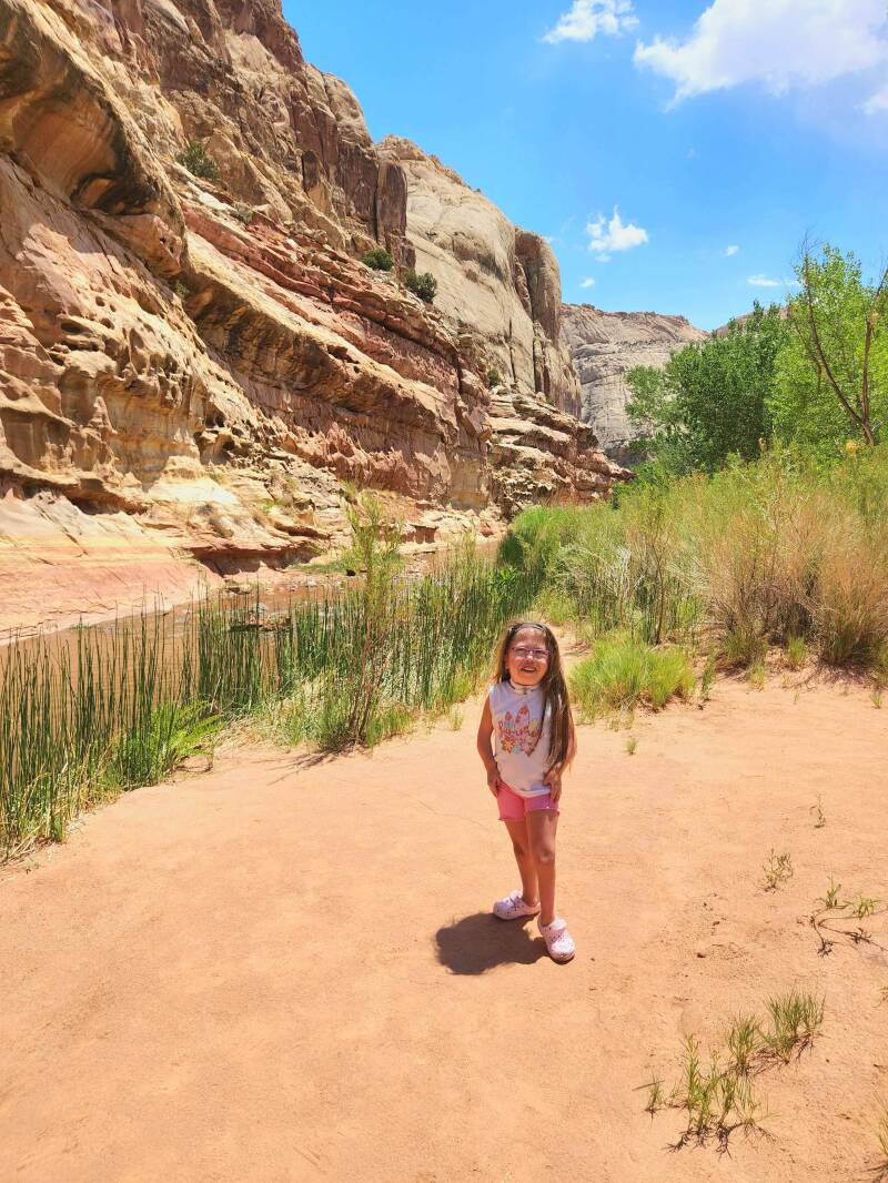 We ended the evening with burgers over the fire with our family at the Fruita campground with a view of the burnt orange cliffs and a pasture with two horses, one of which really took to our trachie. She was brown with black legs, so the girls named her stockings. Our adventures in Capital Reef National Park were remarkable. Two days was enough, but three days would have been better to spend in this truly beautiful area with dramatic landscapes. We would definitely return and stay at the same campground.