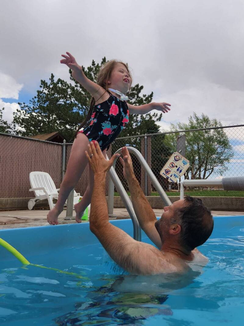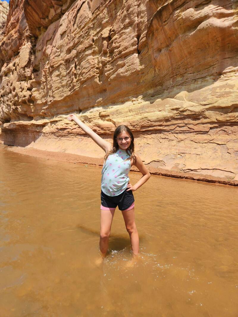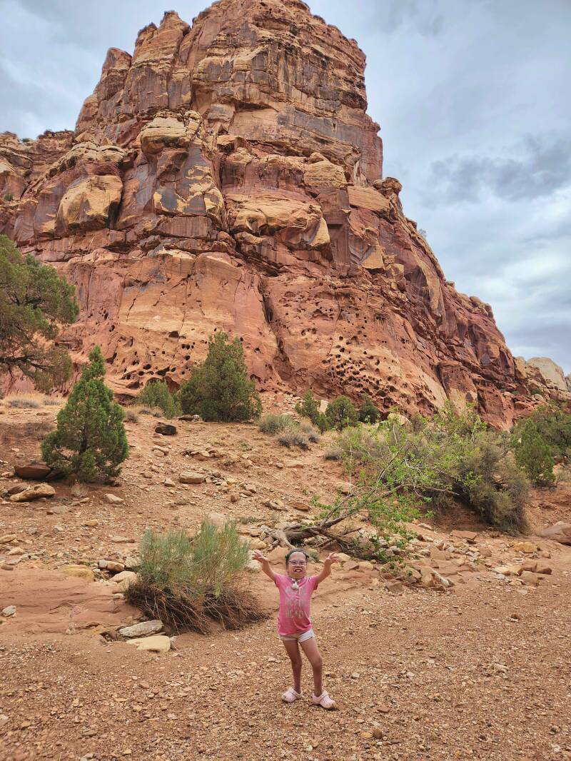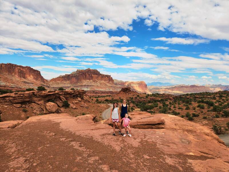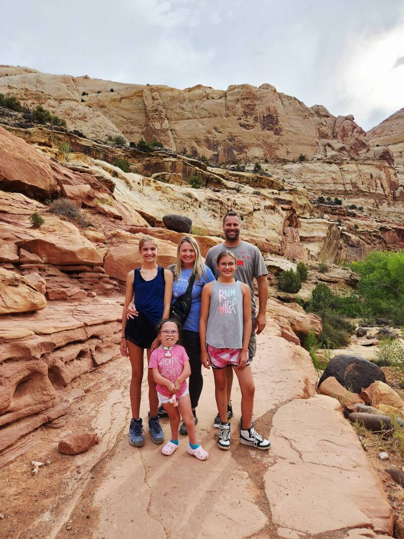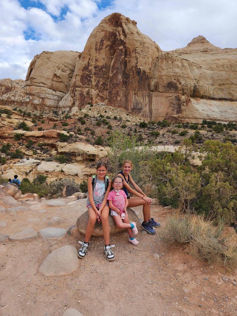 The following day, we took in the sights of Capital Reef National Park, starting with a moderate-difficulty, two-mile hike to Hickman Bridge in sixty-degree temps. It was a spectacular adventure and quite the workout with the steep elevation gain. Along the hike was a cave-like structure which we dubbed the Flintstone house. The girls each had their own “rooms” picked out. A few more yards up the trail, we found the trail’s namesake, an expansive and awe-inspiring arch. We lingered in the area for quite a while taking pictures and just being mesmerized by the beauty and sheer size of the arch. In comparison to the arches we had seen in Moab, UT a few years earlier, this arch is just as impressive. What set it apart is the variation in coloring. It is truly beautiful, and I highly recommend tackling the hike. It was challenging but doable. If we could do it with all that we carry, so can you! (If your knees are bad, you should skip this one.) I carried the 15-pound ventilator, the girls took turns carrying the 10-pound suction/supply bag, and Daddy carried our 40-pound trachie who wasn’t able to walk much of the hike. The payoff was totally worth the effort!