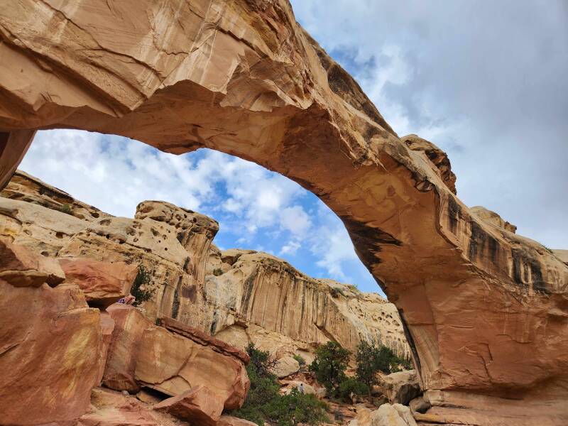We had intended to stop at Goblin Valley State Park to see the unique hoodoos, but we chose to bypass this adventure because of the desert heat. By 10 AM, it was already 90-degrees, and we were still seeking cooler temps. Our campground was Thousand Lakes RV Park in Torrey, UT on the western side of Capital Reef, which meant we drove through some of the national park on our route. Wow! Following a friend’s recommendation, I had downloaded the GuideAlong App and purchased the southeastern US package. As we approached Capital Reef, I started up the audio tour which provided excellent information on all the sights and upcoming pull-offs. One was large enough to fit our truck and camper, so we stretched our legs at the Navajo Dome and found our way down to the Freemont River, which, to our surprise, was flowing rapidly. Not what we expected in a desert climate. The elevation of Capital Reef is around 6,000 feet, and the temps were very comfortable with highs in the low 80s. We had found our cooler temps.
